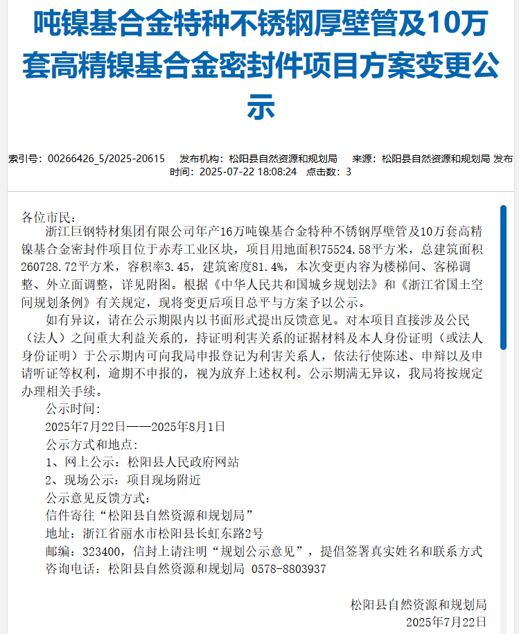 2025年7月22日,浙江巨鋼特材集團(tuán)有限公司年產(chǎn)16萬噸鎳基合金特種不銹鋼厚壁管及10萬套高精鎳基合金密封件項(xiàng)目方案變更公示,公示時間:2025年7月22日-2025年8月1日。